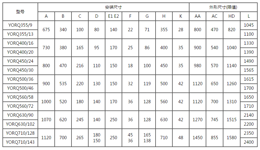 表1 YORQ短系列永磁耦合調(diào)速器外形及安裝尺寸表(機(jī)座號355~630)